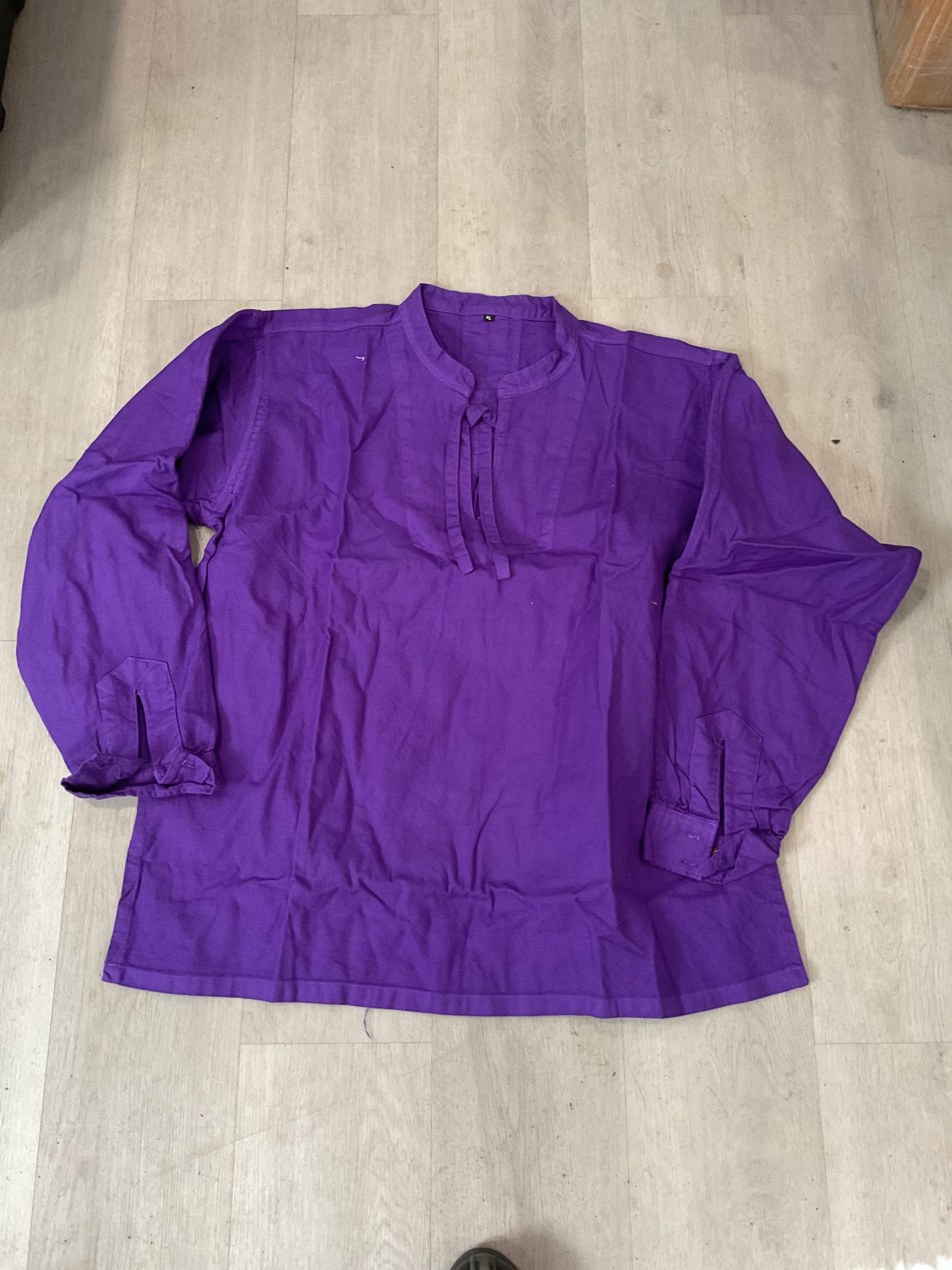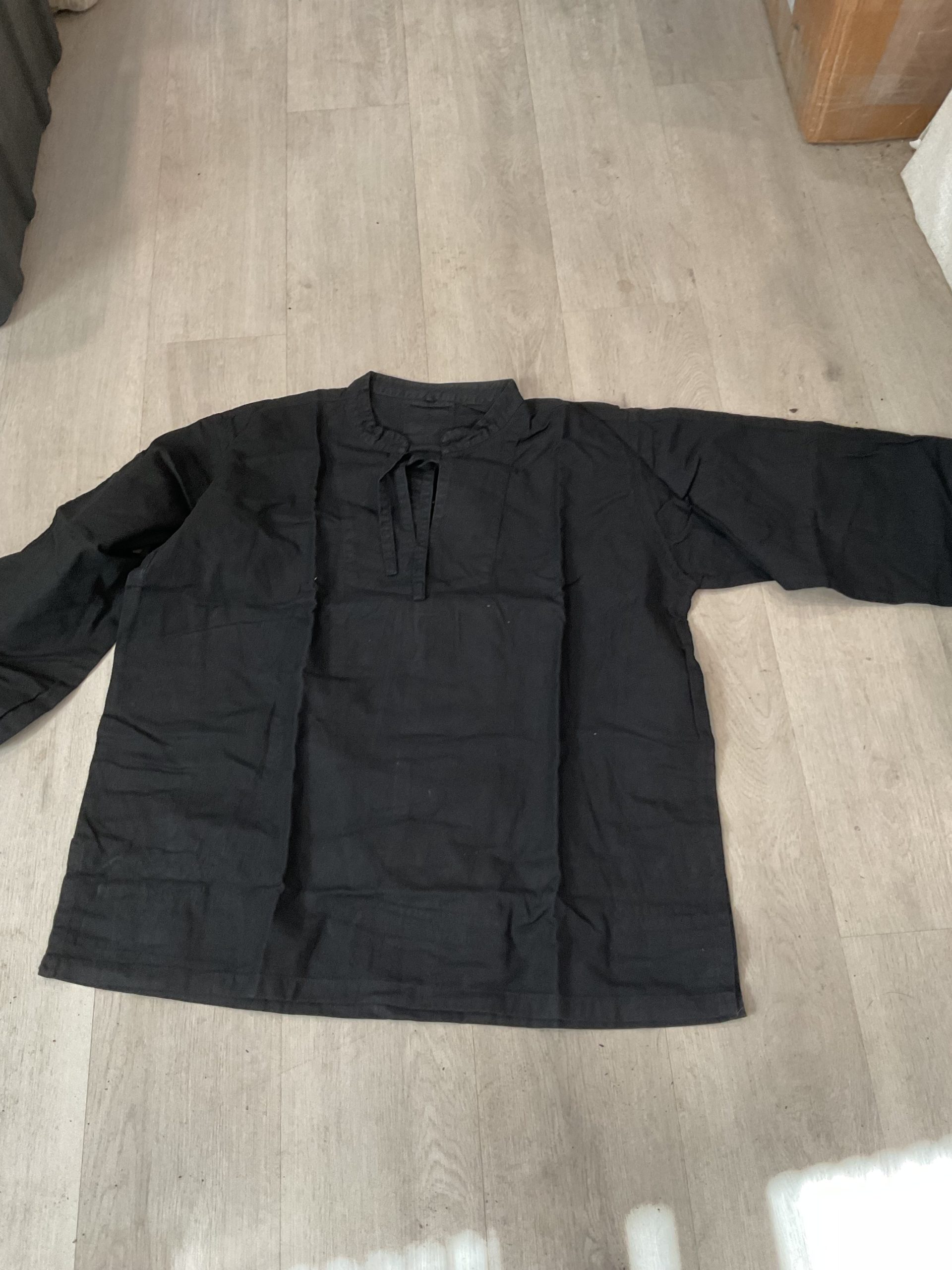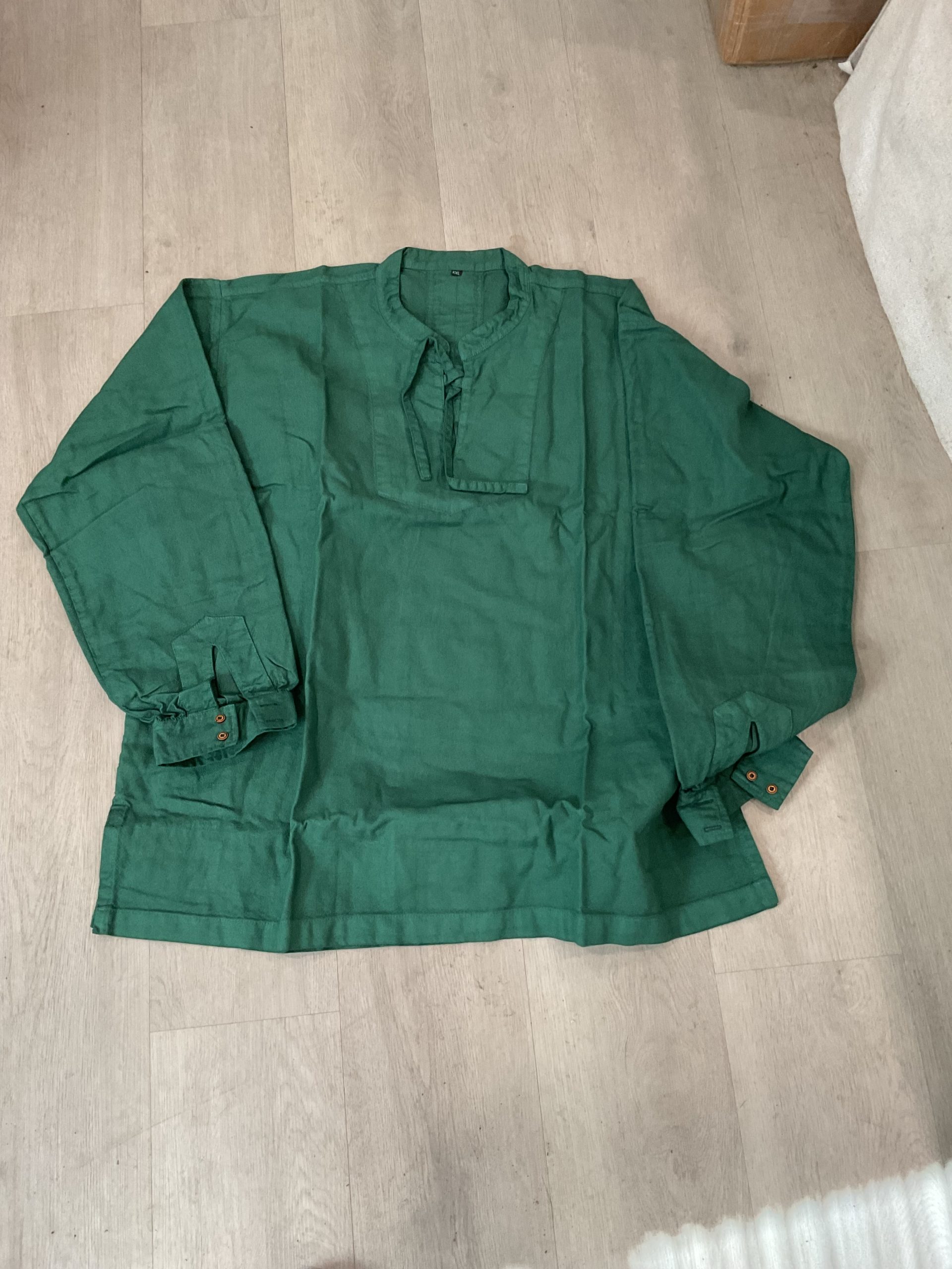 This shirt is 100% cotton.  The buttons are wood and it has a tie closure at the neck. It is sewn with a sturdy gusset in the back for free arm movement, so it can be used by those lifting or swinging swords, throwing axes, or setting up a tent .They are cut large and can be belted. Available from medium to 4X. Small is available in other colors. Please email for more information if you need small.
