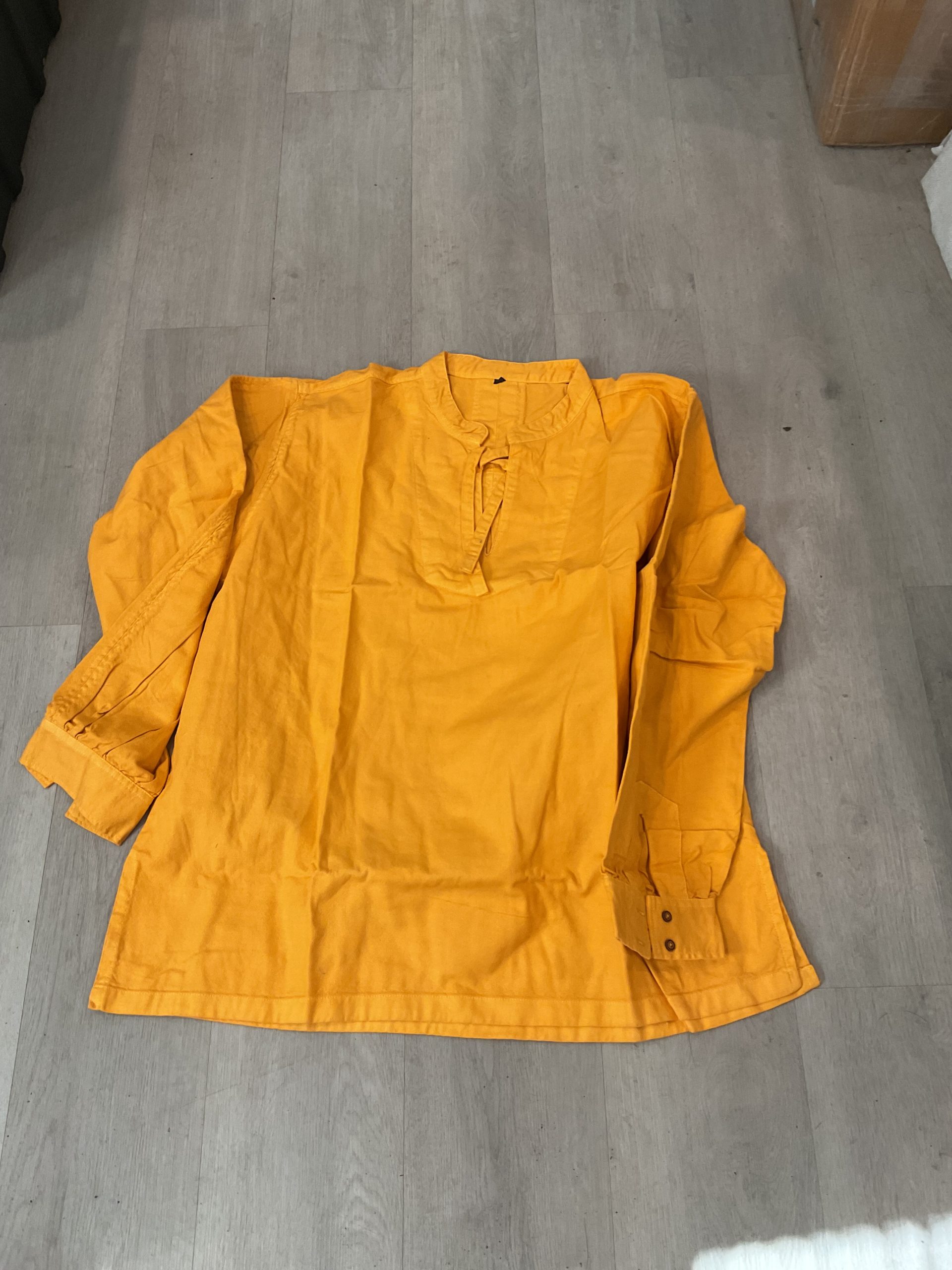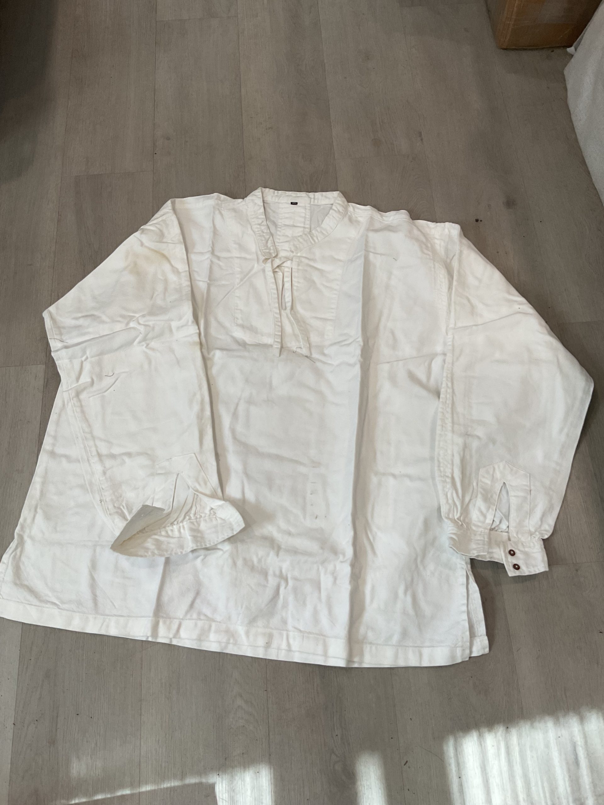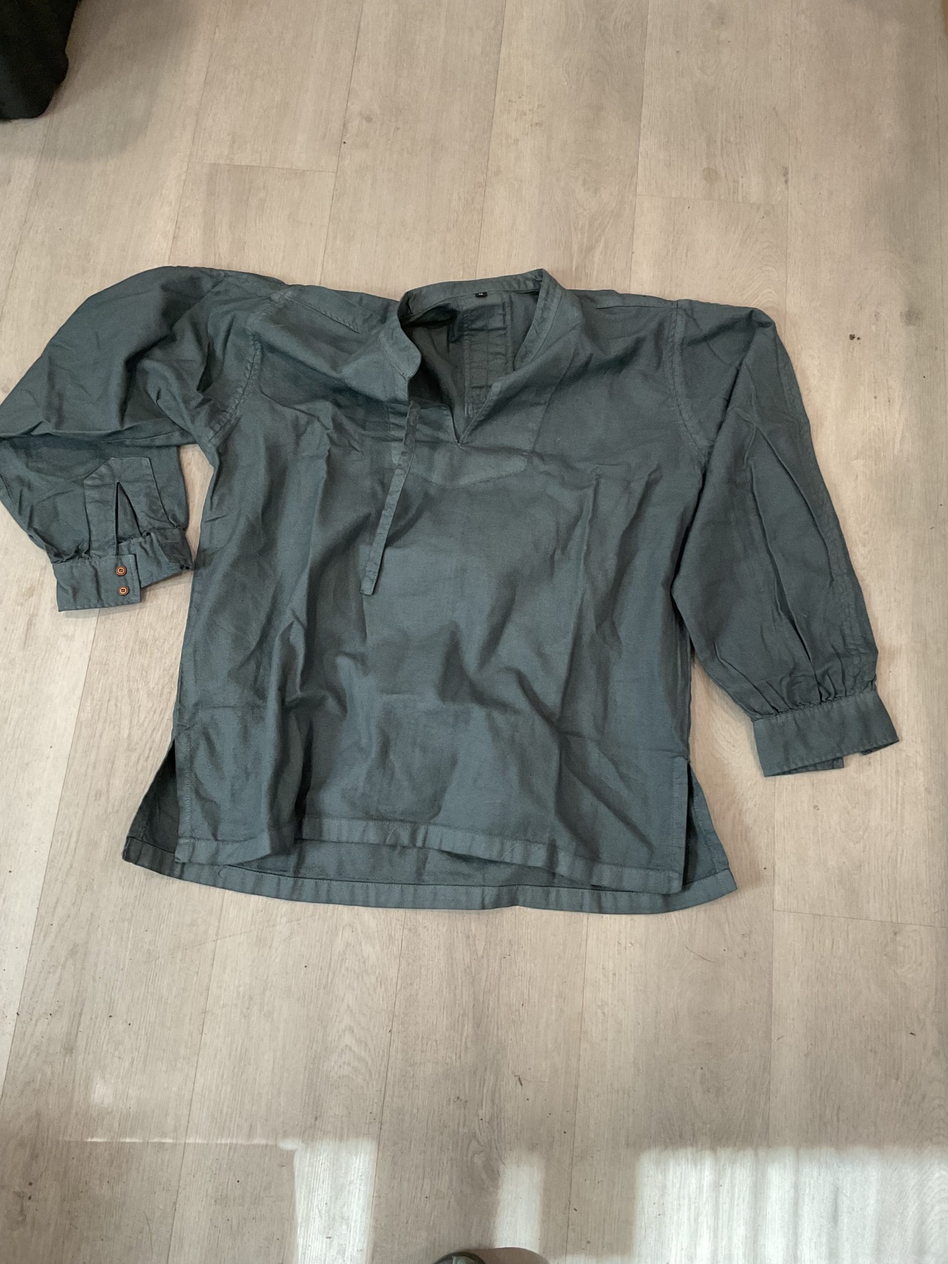 This shirt is 100% cotton.  The buttons are wood and it has a tie closure at the neck. It is sewn with a sturdy gusset in the back for free arm movement, so it can be used by those lifting or swinging swords, throwing axes, or setting up a tent .They are cut large and can be belted. Available from medium to 4X. Small is available in other colors. Please email for more information if you need small.