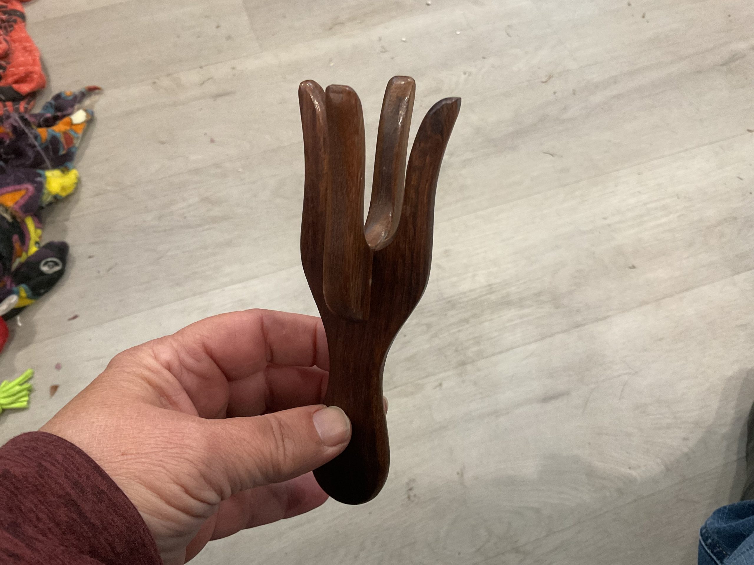 This Lucet has four prongs And can be used to make a thicker springy cord as well as introducing multiple colors into cording.